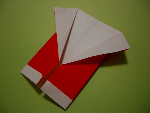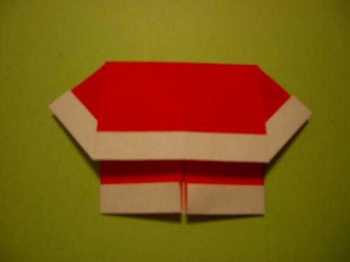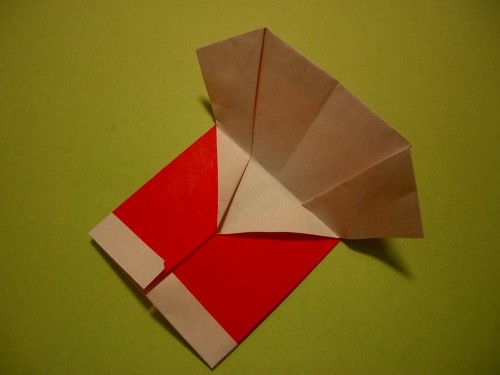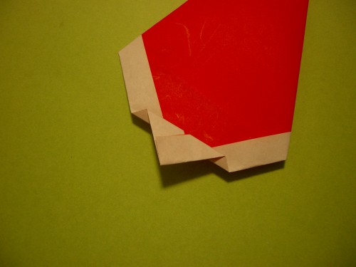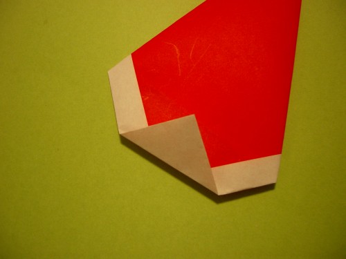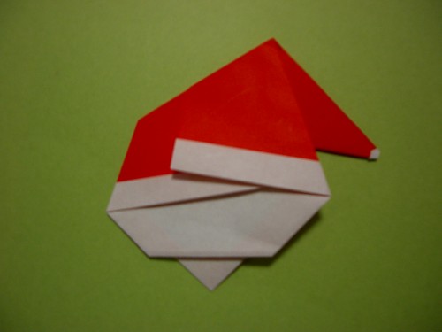 5. Vira novamente a folha e faz uma dobra na parte de cima, como a imagem tem. E aqui está, já feita, a cabeça do nosso Pai Natal. Desenha-lhe uma cara para ainda ficar mais giro!!